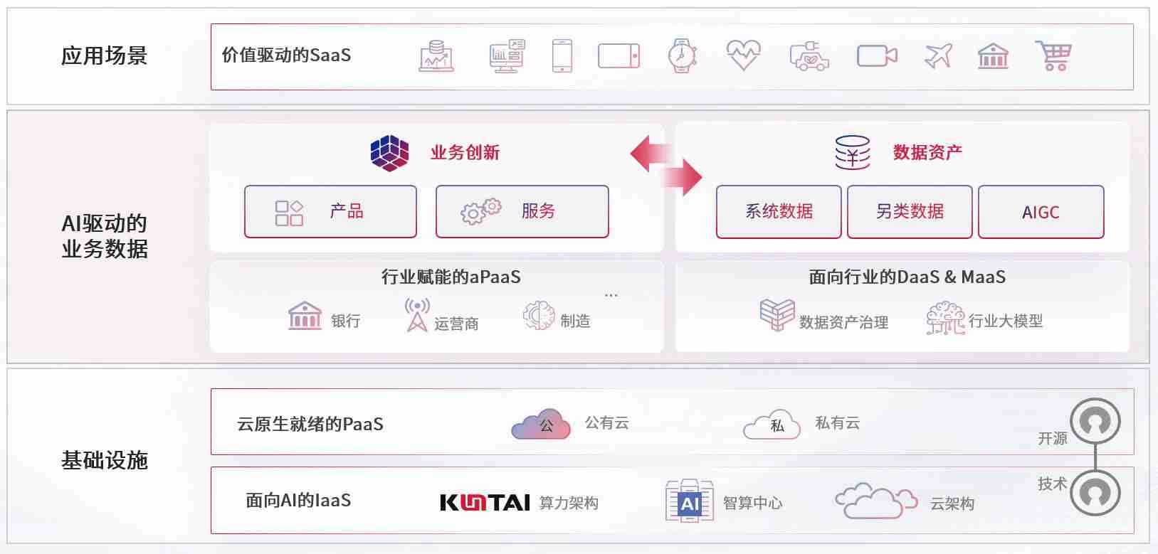 数字时代,,围绕企业数字化转型的关键要素,,,尊龙z6数码开创性的提出数云融合战略和技术体系框架,,,,着力在云原生、、数字原生、、AI原生和信创产业上架构产品和服务能力,,为处在不同数字化转型阶段的快消零售、、、汽车、、、、金融、、医疗、、、政企、、、、教育、、、运营商等行业客户提供泛在的敏捷IT能力和融合的数据驱动能力,,构建跨界融合创新的数字业务场景和新业务模式,,,助力企业级客户建立面向未来的核心能力和竞争优势,,全面推动社会的数字化、、、、智能化转型升级。。