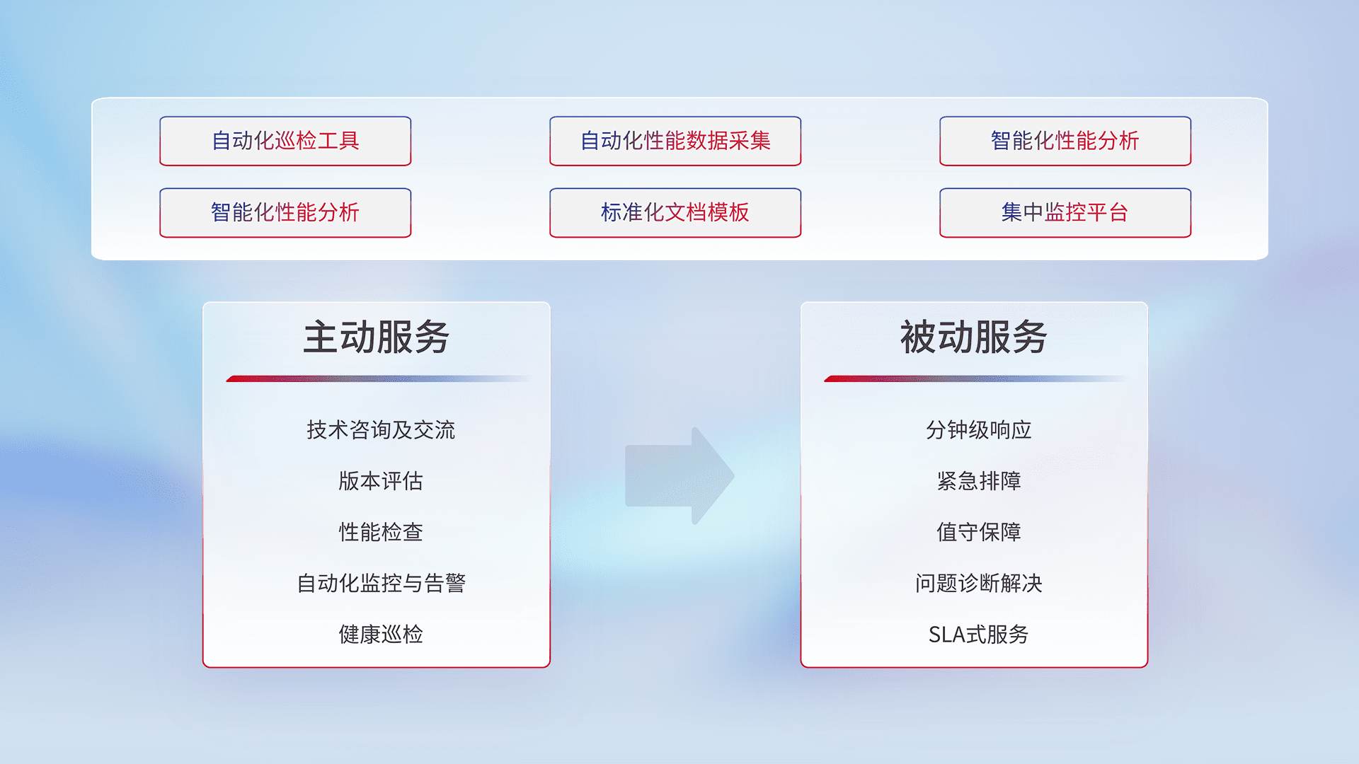 智能化工具和标准化文档,,,保障服务质量,,,提供主动服务(包含技术咨询、、、版本评估、、、性能检查、、自动化监控与告警、、、、健康巡检)和被动服务包含(分钟级响应、、紧急排障、、值守保障、、、问题诊断解决、、SLA服务)。。。。